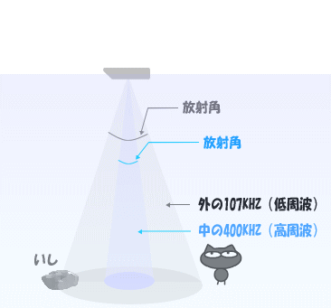 超音波はその性質上、低周波と高周波ではその広がり方が違います。その放射角度を